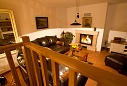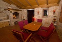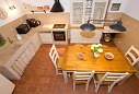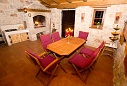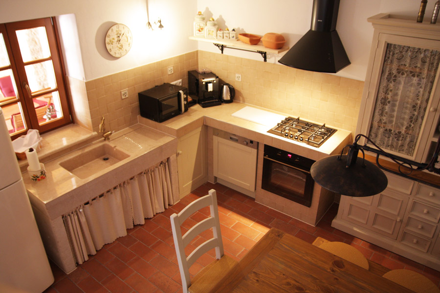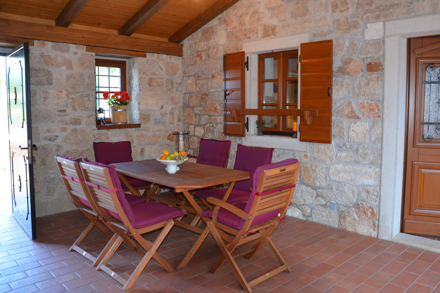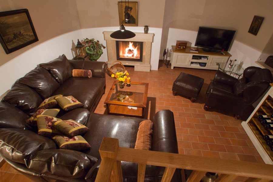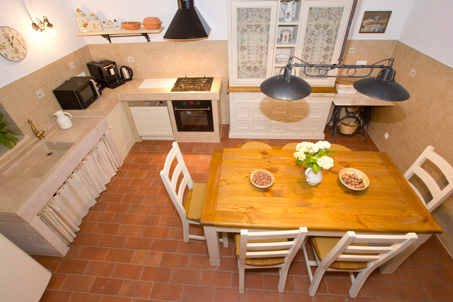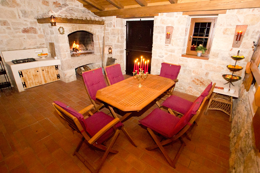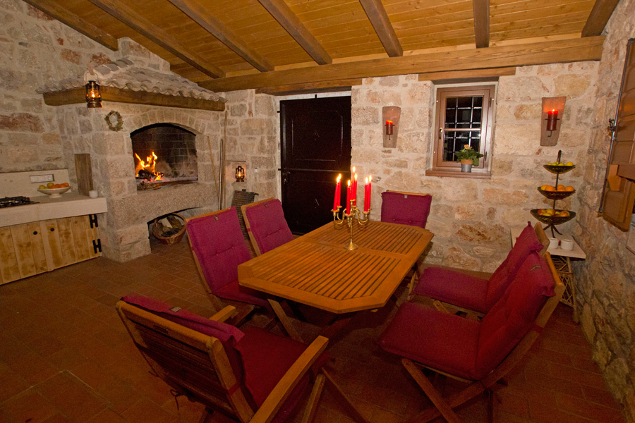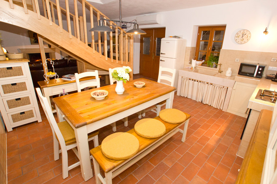 Im Erdgeschoß befindet sich eine große und funktionelle Küche mit Esstisch. Sie ist ausgestattet mit Gas-Herd, Backoffen, Mikrowelle, großem Kühlschrank mit Gefrierfach, Spülmaschine, Kaffemaschine, Espressomaschine und Toaster. Die nach oben führende Treppe trennt die Wohn- und Essküche vom großzügigen Wohnzimmer mit Kamin ,SAT-3D-TV und einem Weinregal. Verschiedene hochwertige Weine der Gegend und anderen Teilen Kroatiens (Preisliste liegt aus) können hier verköstigt werden.
