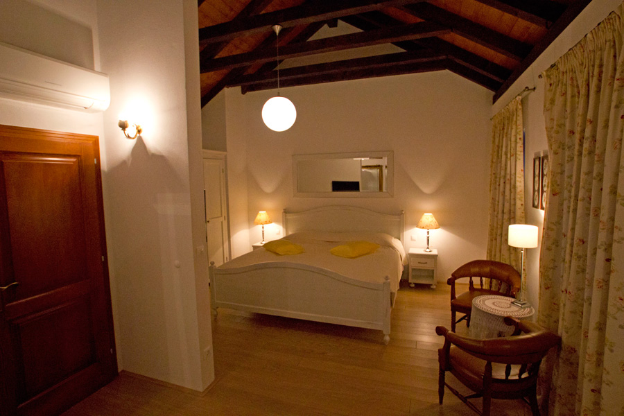 Die Innentreppe führt in die erste Etage. Vom Flur aus gelangen Sie in die drei Schlafzimmer, jeweils mit einem eigenem Bad. Das Masterzimmer mit Doppelbett ist das größte Zimmer. Das Badezimmer ist sehr groß und verfügt über eine Dusche, Badewanne, WC, Bide und Doppelwaschbecken. Von diesem Zimmer haben Sie einen sehr schönen Blick auf den Garten, den Pool und das ca. 5 Km entfernte Meer. Auch die beiden weiteren Zimmer mit Doppelbett (eines davon mit getrennten Betten, die mann zusammenschieben kann) haben einen direkten Zugang in die Bäder mit Dusche und WC. Alle Bäder verfügen über einen Fön und Bademäntel , alle Zimmer sind mit SAT-TV , Klimaanlage und Safe ausgestattet. Ebenso auf der ersten Etage befindet sich eine Waschküche mit Waschmaschine, auch als Abstellraum nutzbar. Im ganzen Haus ist WLAN verfügbar.